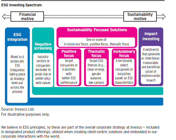 El sector de la gestión de activos así lo está haciendo. La inversión basada en criterios de sostenibilidad (su acrónimo en inglés, ESG Investing) está adquiriendo una tracción muy potente. Las casas de gestión estamos desarrollando múltiples iniciativas para adaptar nuestros procesos de inversión a los criterios ESG. En paralelo, los inversores, especialmente los institucionales, cada vez nos exigen un compromiso más activo y real, más allá de etiquetas, con la inversión responsable. El cuadro que incluimos, elaborado por Invesco, presenta de forma clara y sintética las distintos fórmulas que un fondo puede adoptar para mostrar su nivel de compromiso con la ESG: desde la más ligera, utilizando políticas de exclusión de sectores (no invertir en el sector de armas, o energía fósil, por ejemplo), a las más intensas y directas como las llamadas inversiones o fondos de impacto, una suerte de combinación entre filantropía y retorno.